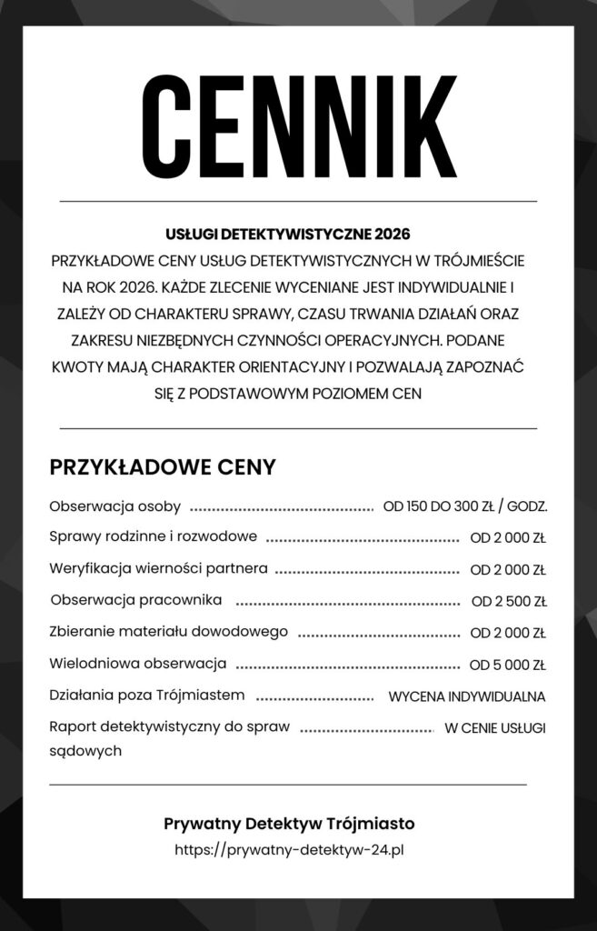 Bardziej skomplikowane sprawy detektywistyczne, wymagające wielodniowej obserwacji, pracy kilku detektywów jednocześnie lub działań prowadzonych poza obszarem Trójmiasta, generują wyższe koszty. Zlecenia obejmujące wyjazdy w teren, monitoring obiektów, działania nocne lub wykorzystanie zaawansowanych środków technicznych mogą sięgać nawet kilkunastu tysięcy złotych. Tego typu usługi są często realizowane na indywidualnie ustalonych warunkach, po wcześniejszej analizie sprawy i potrzeb klienta.